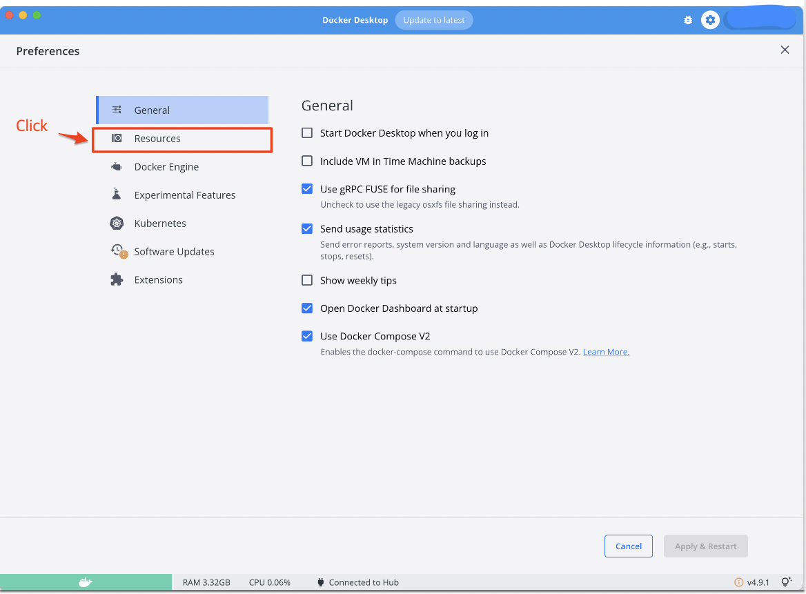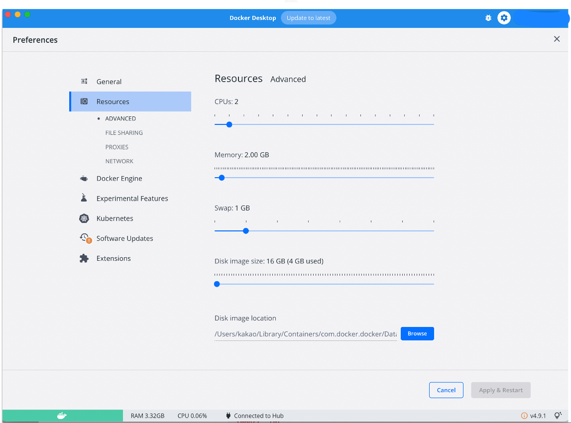 좌측 메뉴에 Resources 를 선택하여 원하는만큼 Resource를 할당하여 수정하고 Apply & Restart 버튼을 클릭한다.